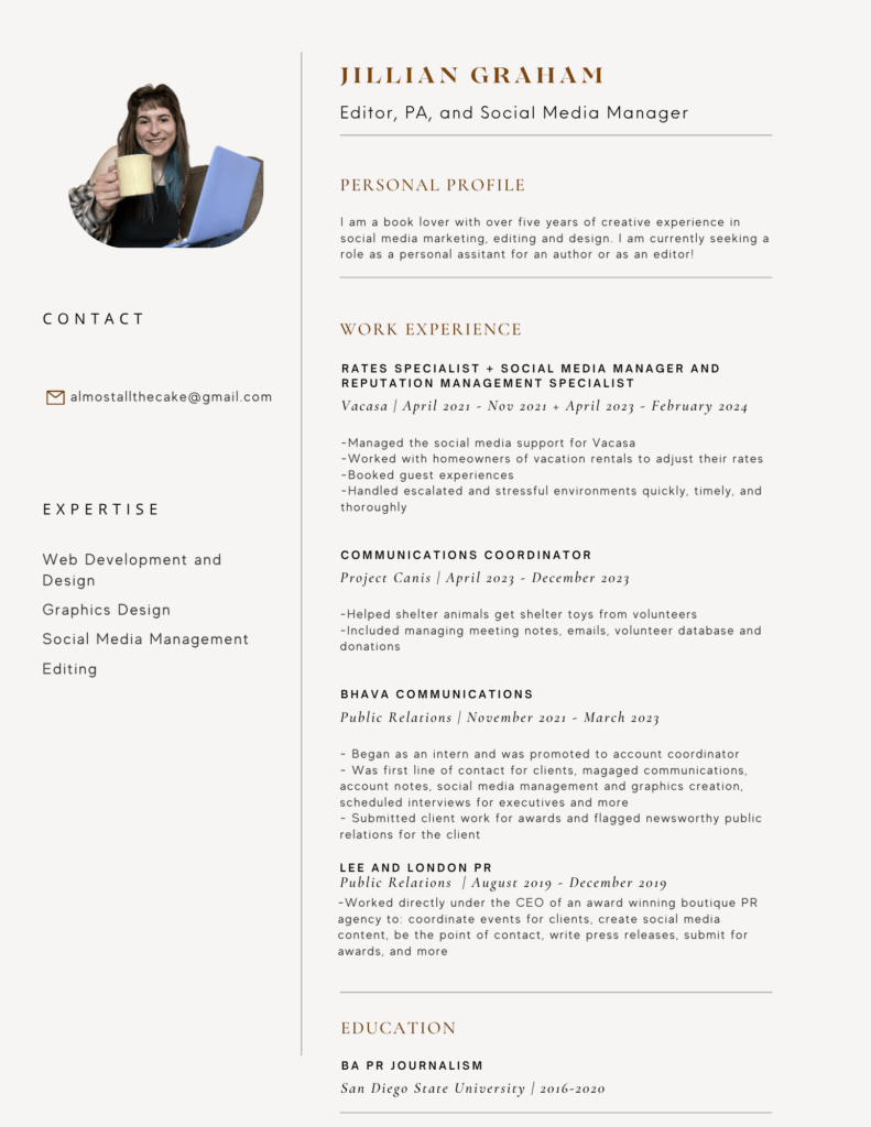 I am a book lover with over five years of creative experience in social media marketing, editing and design. I am currently seeking a role as a personal assitant for an author or as an editor!